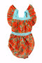There's nothing plain about this playsuit, featuring a frilled yolk and frilled capped sleeves on bright hand printed fabric, this style is a favourite featured in all our collections. Zip down the back for easy on/off.