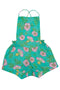 The pretty Honore in our emerald dahlia print features detailing in emerald. The waist is secured with ties on either side, while ruffles extend from the waist to over the shoulder and fabric-covered buttons run down the back. Pop studs enable easy dressing. Comes in cotton voile.